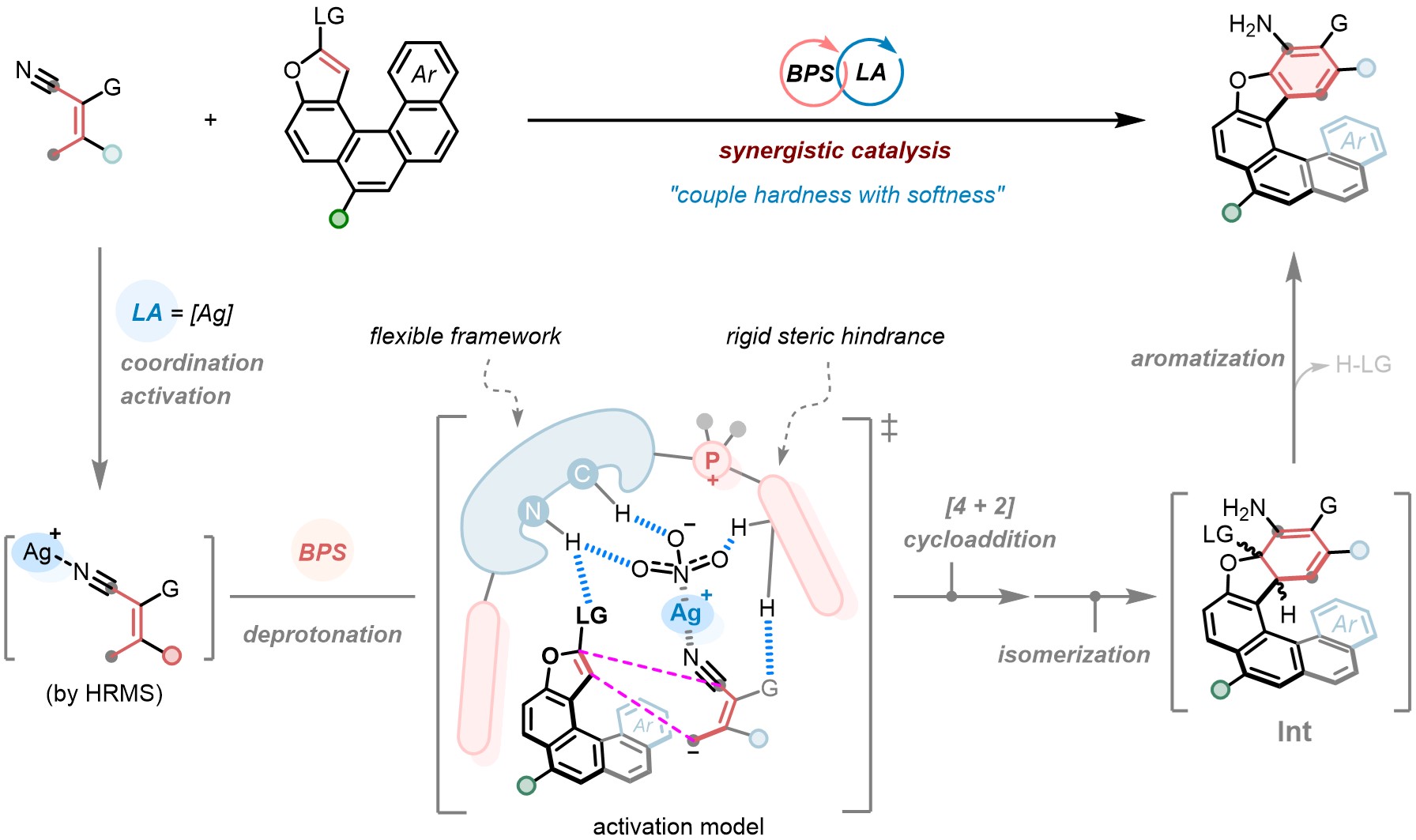 王天利教授团队报道了一种基于手性双功能季鏻盐(BPS)与金属路易斯酸(LA)协同催化的芳环延伸策略,通过巧妙的对映选择性[4 + 2]环化/芳构化串联过程,以高产率与优异的对映选择性构筑了传统方法难以获得的新型氧杂[6]螺烯分子。该方法展现了优秀的官能团耐受性和放大规模合成能力、还可通过后续衍生化便捷获取具有多样生物活性的手性螺烯化合物,显示了该方法的实用性。机理研究表明,硝酸银在底物与催化剂之间充当关键“桥梁”,使得反应以独特的“三明治”型过渡态模式发生;而 BPS 催化剂通过其氢键与离子对作用协同,精准调控该反应的立体选择性。这项工作不仅拓展了手性螺烯化合物的分子骨架,更为开发新型离子对/路易斯酸协同催化模式来解决挑战性不对称合成难题提供了思想指导。